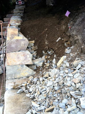 After we had built all those details over some period of time, we could finally begin our wall. We needed the cantilevered stairs, and dry stone retaining wall in to function as our wall end on the left.