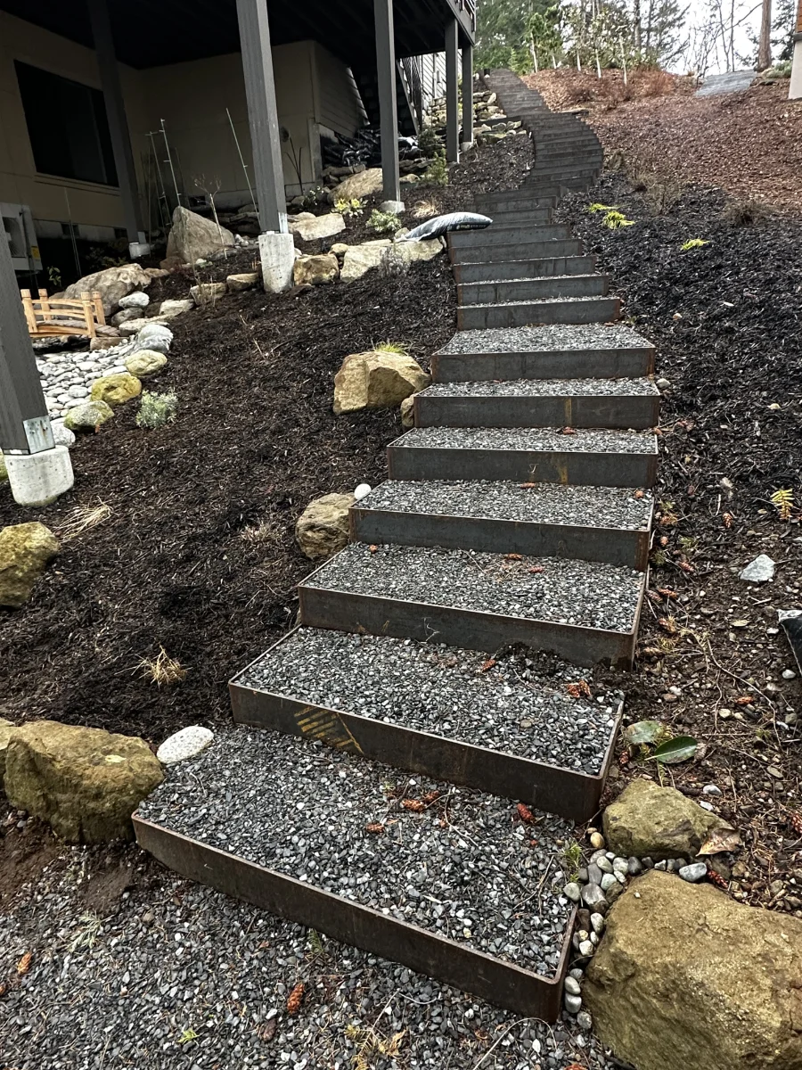 Whether you’re drawn to the organic texture of natural stone or the sleek durability of steel, we design stairways that reflect your style and stand the test of time. Each staircase is carefully constructed to complement surrounding hardscapes and terrain, enhancing the natural flow of your outdoor space.